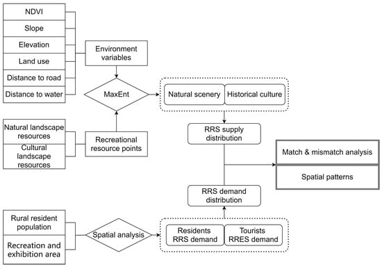In this research, we constructed an integrated framework to map and evaluate the spatial distribution of RRS supply and demand in Changhong Township, subsequently exploring the supply–demand relationships and proposing management strategies. Furthermore, this study was intended to propose a scientific framework for informing spatial planning and policymaking in national park recreation.