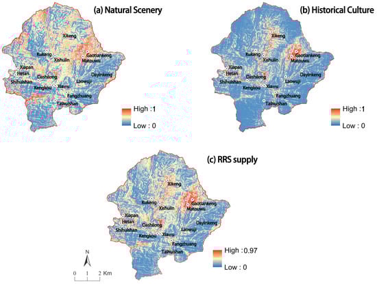 In order to synthesize natural scenery and historical culture, the two service types were weighted and summed, each with a weight of 0.5, to obtain the RRS supply distribution map (Figure 3c). Based on the distribution results, the integrated supply distribution resembled the two types of cultural services’ distribution, with the high-supply areas mainly located in Gaotiankeng, Matouwu, and Xikeng in the northern part of Changhong Township, Kengkou, and Fangzhuang in the southern part of the township. In general, the distribution of RRS supply in Changhong Township exhibited significant spatial heterogeneity.