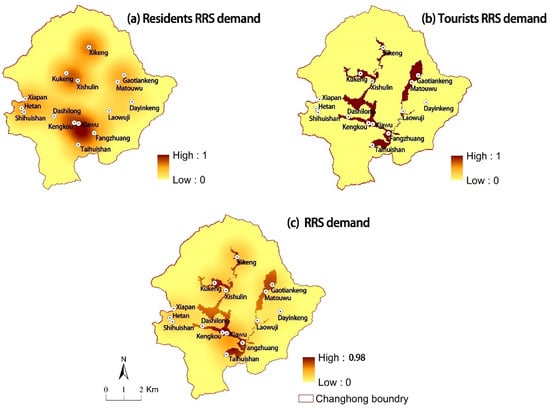 After superimposing the recreational demand of residents and visitors to obtain the combined RRS demand, the high-demand area included four clusters (Figure 4c): Xiawu and Kengkou, Gaotiankeng and Matouwu, Kukeng and Xilinlin, and Xikeng. It was clear that the areas with high RRS demand were mainly in the villages located in the middle of the Changhong Township, and the demand decreased with the distance from the village center, resulting in the lowest demand in the peripheral forest area.