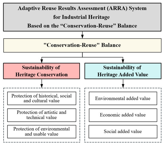 In the field of architecture, scholars’ studies on the results assessment of adaptive reuse are mostly found in historical buildings and are defined as “post-reuse” or “reuse process” [30,31], while there is a lack of results assessment models for industrial heritage. Therefore, this study defines the results assessment model for industrial heritage as “adaptive reuse results assessment (ARRA)” in order to provide replicable experiences for researchers of industrial heritage.