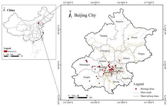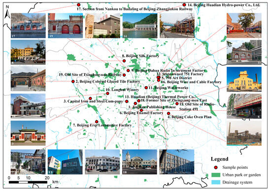 As the current census activities for industrial heritage in Beijing have not yet been carried out, the number of heritage sites is not clear. In order to improve the comprehensiveness of the sample data, this study collected and organized data based on the following resources: (1) 8 batches of national key cultural relics protection units; (2) 9 batches of municipal cultural relics protection units; (3) 5 batches of national industrial heritage lists; (4) 3 batches of Chinese industrial heritage protection lists; (5) 1 batch of Beijing’s industrial heritage lists; (6) 7 batches of Chinese 20th-century architectural heritage lists; (7) 3 batches of lists of Beijing historic buildings; (8) relevant academic literature [44]; and (9) field investigation. Based on the results of the above data, the Beijing industrial heritage list was established with 59 samples, and the Beijing industrial heritage GIS database was constructed by applying ArcGIS 10.8 software (Figure 2).