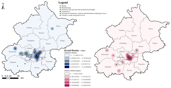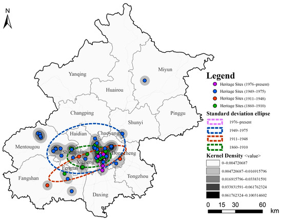 Based on the historical stages of Beijing modern industrial development [45], this study divides the development of Beijing industrial heritage into four periods: the period of the Qing government (1860–1910), the period of the Republic of China (1911–1948), the early period of the founding of New China (1949–1975), and the period of reform and opening up (1976–present). Using the kernel density and standard deviation ellipse tools in ArcGIS, we analyze the spatiotemporal evolution patterns of Beijing industrial heritage (Figure 3). In the temporal dimension, Beijing modern industry developed rapidly from 1949 to 1975 [46], laying the foundation for the revitalization and utilization of the modern industrial heritage, such as the industrial parks of the State-Owned 751 Factory and the State-Owned 768 Factory, which are examples in this context. In the spatial dimension, the scope of the heritage gradually expands from an elongated east–west pattern to a large ellipse, extending to the northeast–southwest, and the high-density area is concentrated in the central urban area and Mentougou District, which indicates that most of the industrial plants in Beijing are located in the core of the city with convenient transportation and rich peripheral support, as well as in the area adjacent to the water system, which provide the environmental conditions and resource endowments for the transformation of the industrial heritage to the new industries after the industrial restructuring. These geographical advantages provide environmental conditions and resource endowments for the transformation of industrial heritage into new industries after industrial restructuring.