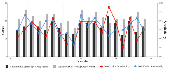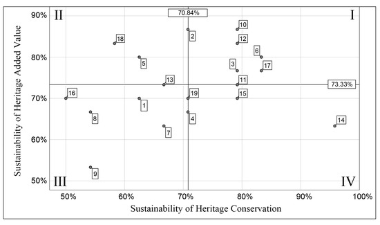 Percentage frequency analyses of assessment indicator scores were conducted to obtain assessment results based on the “conservation–reuse” balance. Combining the results of the indicator scores in Table 4 and using the ARRA calculation model (Equations (1) and (2)) to calculate the “construction sustainability” and “added value sustainability”, respectively, we obtained the percentage frequencies of sustainability for the 19 samples (Table 5). In this case, a higher percentage value for “conservation sustainability” means that the sample is better protected in terms of the indicator “sustainability of heritage conservation”; conversely, a lower percentage means that the sample meets only the minimum standard of conservation. The same applies to “added value sustainability”.