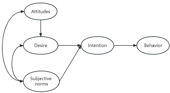 According to Bagozzi, emotional desire is a factor that will arouse intention. The original factors, attitude and subjective norm, will cause emotionally motivated desire. In scholars’ research, desires will influence intention and, furthermore, influence behavior [22,23]. The TSR model is based on the structure of the TRA model and TPB model, which is the impact of subjective norms on intention (Figure 1). Attitude refers to a person’s mental view regarding the way the person thinks or feels about something [24]. Desire is usually a strong feeling of wanting something, usually an emotional desire [25]. Intention is a definite intention or inclination [26]. When it comes to intention, people are very clear about doing this thing [27]. The degree between these three is gradually deepening [28], and the core of the TSR is desires. Intention refers to autonomous planning behavior, while desire refers to the thoughts that people want to realize expectations [29,30].