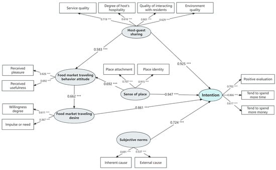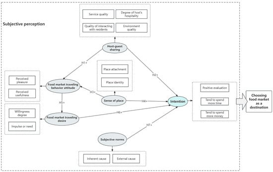 In detail, the sense of place contains place identity and place attachment. Food market traveling behavior attitude contains perceived pleasure and perceived usefulness. Food market traveling desire includes willingness degree and impulse or need. Subjective norms for choosing a food market as a tourist destination can be explained by inherent causes and external causes. The intention of choosing a food market as a tourist destination contains a degree of openness and sharing, a degree of interest coordination, social and economic conditions, and environment quality (Figure 3).