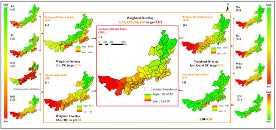 Spatial distribution pattern and calculation process of EHI sub-indicators: ecological pattern indicators include EL (a1), PC (a2), and Ecological Pattern Index (EPI) (a); ecological function indicators include Qw (b1), Qs (b2), WRC (b3), and Ecological Function Index (EFI) (b); biodiversity indicators included KSr (c1), HQI (c2), and Biodiversity Index (BI) (c); ecological stress indicators, including LDI (d1) and Ecological Stress Index (ESI) (d). Using weighted overlay to integrate EPI, EFI, BI, and ESI to obtain the spatial distribution pattern of Ecological Health Index (EHI) (e). Note: EHI stands for Ecological Health Index; EL stands for the ecological land area ratio index, PC stands for the connectivity of important ecological spaces index; Qw stands for the windbreak and sand fixation index, Qs stands for the soil and water conservation index, WRC stands for the water conservation index; KSr stand for the Priority Protection Organisms index, HQI stands for the Habitat Quality Index; LDI stands for the land-based development interference index. Secondary indicators are shown in black, primary indicators are shown in orange, and final indicators (i.e., EHI) are shown in red.
