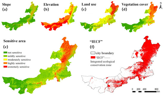 (a–d) Results of the identification of ecologically sensitive areas in Inner Mongolia, which are slope (a), elevation (b), land use (c), and vegetation cover (d) sensitive areas, respectively; (e–f) results of identification of ecologically sensitive areas (e) and identification of ecologically comprehensive protection areas (f). Note: IECF stands for “Integrated Ecological Conservation Zone”.