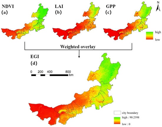 Spatial distribution of NDVI (a), LAI (b), GPP (c), and EGI (d). Note: NDVI stands for Normalized Difference Vegetation Index, LAI stands for Leaf Area Index, GPP stands for Gross Primary Productivity, and EGI stands for Ecological Greenness Index.