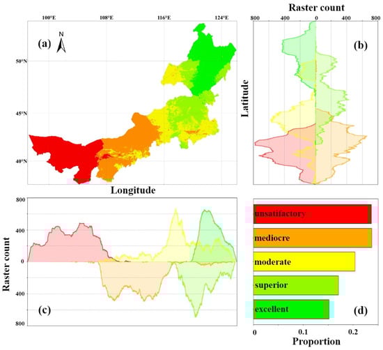 Using a 1 km × 1 km raster scale, the comprehensive ecological quality was assessed and categorized into five grades: unsatisfactory, mediocre, moderate, superior, and excellent. This classification was achieved using the natural breakpoint method, which allowed for the identification of the spatial distribution pattern of ecological quality across Inner Mongolia. The reclassified raster data were then statistically analyzed to determine the number of raster cells corresponding to each grade at both longitude and latitude scales. Areas with the highest concentration of low-value raster cells were identified, highlighting key regions of poorer ecological quality that require priority attention and ecological restoration efforts.