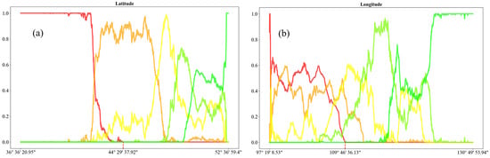 Results of regional positioning of different ecological quality levels. (a): Latitudinal scale; (b): Longitudinal scale. Note: The graph contains five lines, each representing a different level of Ecological Quality: red indicates “Unsatisfactory”, orange denotes “Mediocre”, yellow signifies “Moderate”, light green represents “Superior” and green signifies “Excellent”.