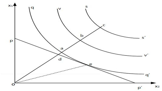 As shown in Figure 1, the iso-production lines ss’, vv’, and qq’ are represented as y the same amount of output (which is different from the general iso-production curve). The realistic production point is c, and oc is the factor mix ratio line, i.e., all points on the oc line have the same factor mix ratio. First, from the analysis of technical efficiency, when the amount of factor inputs and factor combinations are unchanged, when the level of technology improves, it will reach a state of efficient production, i.e., y reaches the efficient ideal output. If y output is unchanged, then the factor inputs in agricultural production will be reduced; at this point, c will move down to the technically effective b point isoquant vv’; at this point, c for the production of technical efficiency, that is, TE = ob/oc. Secondly, analyzing the scale efficiency, when the factor combination rate and the technology level are kept constant, the ideal scale economy is generally achieved by regulating the number of input factors. Similarly, if y output is unchanged, then the production process of digital agriculture will save costs; at this time, from point b to point a move from the equal production line vv’ to equal production line qq’, the efficiency of scale is: SE = oa/ob. Finally, analyzing from the efficiency of factor combination, pp’ denotes the equal cost line, and point e at the tangent of pp’ and qq’ is the equilibrium point to realize the optimal factor input combination. The cost required to produce the output will reach the minimum value at this point e. At this point, the factor mix efficiency of agricultural production at point a is CE = od/oa.