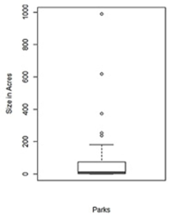 The authors also dropped park-designated parcels from the study, which were undeveloped median-sized parks surrounded by highway exits or thoroughfares, as determined by visual inspection of Google Earth satellite imagery []. While these parcels met the criteria for 50% vegetated spaces, they could not be safely accessed and used by citizens for recreation. After aggregating and applying the vegetation criteria to the park data, the original 811 park parcels were reduced to a total of 219 parks in this study. The Euclidean distances in feet and miles from each house sold to the nearest park were calculated in ArcGIS. The park-size data revealed a highly skewed distribution due to outliers (Figure 2). The authors excluded houses near parks greater than 400 acres to avoid impacts from extremely large parks. This resulted in a median park size of 9.65 acres.