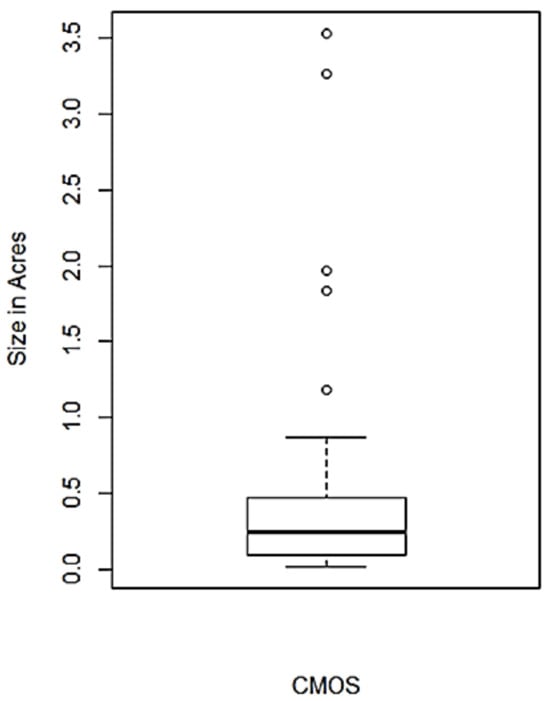 The CMOS data were obtained from the Baltimore Neighborhood Indicators Alliance-Jacob France Institute, the BNIA-JFI []. The CMOS data, which contained only centroid information, were matched with the City of Baltimore’s parcel data using the block lot fields to obtain the polygons for CMOSs in ArcGIS. Unmatched CMOSs were reviewed using Google Earth satellite imagery and reassigned to their correct block lot numbers []. Two CMOS locations could not be verified using this method and were therefore dropped from the study. The total acreage for each CMOS was calculated using ArcGIS. There were a total of 504 CMOS parcels, and these covered a total of 34 acres.