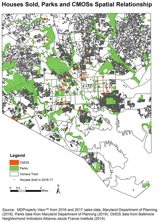 ArcGIS was used to map house purchases, parks, and CMOSs and revealed the spatial relationships among them. As shown in Figure 4, houses were sold throughout the city, aside from the industrialized areas (confirmed via Google Maps) in the south []. Parks were spread throughout Baltimore. There were also several very large parks to the west, north, and east and there was a large cluster of house purchases around a park on the east side of Baltimore. A search on Google Maps revealed this site to be Patterson Park []. Compared to the parks, the CMOSs were relatively small and were found more frequently near the city’s core.