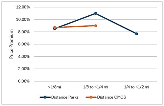 Thus, the proximate price premiums for distances to a park ranged from 8.54% for park adjacency up to an 1/8 of a mile, 11.01% for an 1/8 to a 1/4 of a mile, and 7.73% for a 1/4 to a 1/2 of a mile compared to houses more than a 1/2 mile away. The premium for distances to a CMOS of up to an 1/8 of a mile was 8.69%, and for an 1/8 to a 1/4 of a mile, it was 8.96% compared to houses more than a 1/2 mile away. The 1/4 to 1/2 mile distance to a CMOS was not significant. Both the park and CMOS proximate price premiums were highest for the 1/8 to 1/4 mile distance. Figure 6 shows a comparison park and CMOS proximate price premiums.