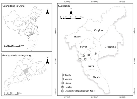 Guangzhou, the capital of Guangdong Province, China, is one of five nationally central cities. Guangzhou is located on the Pearl River Delta and is at the forefront of China’s reform and opening-up process. Guangzhou is divided into 11 districts (Tianhe, Yuexiu, Liwan, Haizhu, Guangzhou Development Zone, Panyu, Nansha, Baiyun, Zengcheng, Huadu, and Conghua) [58], covering a total area of approximately 7434.40 km2 (Figure 1).