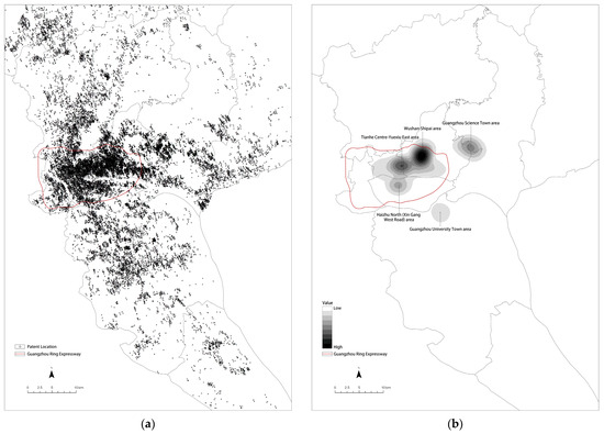 Spatial distribution of patents in Guangzhou. (a) Location; (b) kernel density analysis.