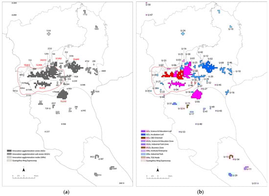 The 53 innovation space units can be categorised into three levels—innovation agglomeration zones (IAZs), innovation agglomeration sub-zones (IASZs), and innovation agglomeration nodes (IANs)—which exhibit a core–periphery structure, extending from the urban centre to the suburbs and then outskirts. IAZs are located in the urban centre or suburbs, IASZs are found in the suburbs, and IANs are found on the outskirts. The 53 spatial innovation units can be further classified into nine types: IAZs, Science and Education-Led; IAZs, Incubation-Led; IAZs, CBD-Oriented; IASZs, Science and Education Zone; IASZs, Industrial Park Zone; IASZs, Business Zone; IANs, Institute/Enterprise; IANs, Industrial Park; and IANs, TOD Node (Table 2 and Figure 3).