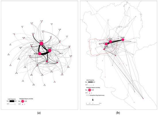 Innovation networks in Guangzhou. (a) Topological structure of networks; (b) spatial structure of networks.