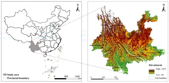 Yunnan Province is located in the southwestern part of China (Figure 1). The province features complex terrain, primarily consisting of plateau mountains, with numerous karst landforms and deep valleys. The elevation difference is 6663.6 m, with significant variations in altitude. The climate conditions in the study area are diverse, ranging from a temperate climate in the north to a subtropical climate in the south. Precipitation varies between 540 mm and 2300 mm. YNP is abundant in lakes and boasts a well-developed water system, offering ample water resources. The diverse climatic conditions and unique natural geographical features contribute to the province’s complex and diverse ecosystems, making it a crucial ecological barrier and a key area for water conservation. Economically, YNP’s main industries are agriculture and tourism. Over the past few years, as urbanization has rapidly increased, the province’s GDP has continued to grow, but it also faces challenges related to land use changes. Agricultural expansion and urban construction have strained land resources, resulting in the deterioration of some natural ecosystems. Many tourist attractions are close to ecologically important areas, and the development of tourism has led to more frequent land use changes in these areas []. In particular, around important water bodies like Dianchi Lake and Erhai Lake, pollution from urbanization and unreasonable development has led to ecological issues, including declining water quality and decreasing wetlands [,].