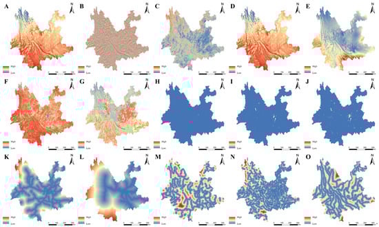 Driving factors of land expansion. (A) DEM, (B) Aspect, (C) Slope, (D) Temperature, (E) Precipitation, (F) NDVI, (G) Soil type, (H) GDP, (I) Population, (J) Night light, (K) Distance to highway, (L) Distance to railway, (M) Distance to urban main roads, (N) Distance to urban secondary roads, (O) Distance to water.