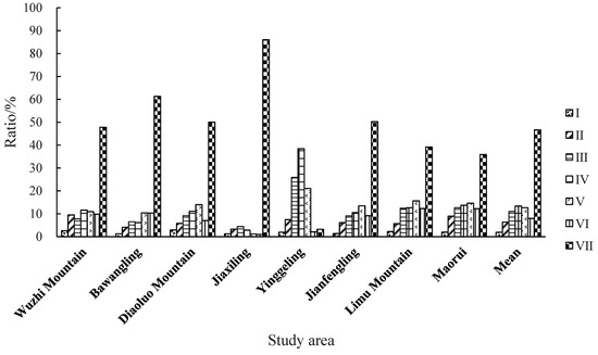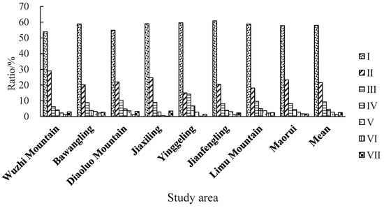 Based on the sample plot survey and in accordance with similar studies [24,25], the standing trees were divided into seven diameter classes based on their size in centimeters: I (1 ≤ DBH < 5), II (5 ≤ DBH < 10), III (10 ≤ DBH < 15), IV (15 ≤ DBH < 20), V (20 ≤ DBH < 25), VI (25 ≤ DBH < 30) and VII (DBH ≥ 30).