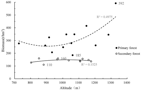 Regression analysis statistics were performed on the relationship between the aboveground biomass per unit area and the altitude of the 24 sample plots in the eight areas by using an independent 900 m2 sample plot as the unit. The results indicate that the aboveground biomass of tropical montane rainforests presented a pattern of initial decline that then rose with increasing altitude. The highest aboveground biomass per unit area was 592.0 t·hm−2 and the lowest was 110.0 t·hm−2. The average aboveground biomass per unit area was 319.0 t·hm−2 for primary forests and 143.0 t·hm−2 for secondary forests, and the aboveground biomass per unit area of primary forests was similarly generally higher than that of secondary forests. Initially, the aboveground biomass of primary forests decreased, but then it rose steadily with increasing altitude. In contrast, the aboveground biomass of secondary forests increased slightly before decreasing, and it showed relatively minor changes throughout (Figure 4).