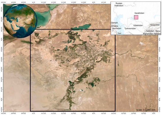 The Syrdarya River (SR), originating in the mountains of Tian Shan, crosses various countries in Central Asia (CA), including Kyrgyzstan and Kazakhstan. Its lower streams and its delta are located on the eastern shores of the Aral Sea, in present-day Kazakhstan [,,,]. The SR, also known in some historical documents by the name of “Jaxartes River”, is an important landmark in CA geography and history as a central water source that flows through semi-arid and arid landscapes [,,,,,]. Inland deltas are formed at the meeting point of the river with a large water body, where the river water splits, and the branches of its water streams shape, cross and spread, creating the delta landscape [,,]. Prior to the influence of the USSR, the SD was subjected to less intensive agricultural practices than the Amudarya Delta (AD), which, with the SD, are the two large deltas of the Aral Sea, and therefore, it provides a useful case study (Figure 1).