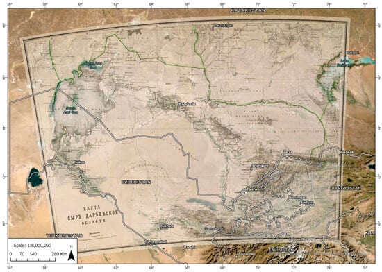 Tsarist Russia historical map presenting the Syrdarya River and the Syrdarya Delta, georeferenced with GIS and laid on a modern satellite image. Source of the map: http://www.cawater-info.net/library/oldmap_e.htm (accessed on 5 February 2022).
