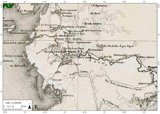 Throughout history, different agricultural infrastructure and irrigation systems were built by different rulers on the Syrdarya River banks, and in SD landscapes in particular, largely because the SD is located in semi-arid and arid landscapes, where water sources are sparse [,,,,,,,].The interactions between humans and the fragile ecological system in the SD are noted and mentioned in the early expeditionary reports of those who surveyed it [,,,,,,,] as discussed in the next part of this section. Additionally, phases of environmental and hydrological changes in different SD water streams and meanders resulting from its natural deltaic dynamic environments are mentioned and reflected in different historical and contemporary sources [,,].
