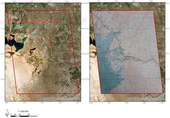 Georeferenced historical, formerly secret, Soviet Army map at a scale of 1:100,000 of the SD and the Kyzylkum Desert on the northern shores of the Aral Sea, 1978 [,]. Satellite image source: Landsat satellite image from 5 July 2019.