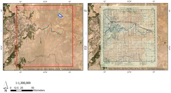 The SD and Kyzylkum Desert study area. A formerly classified Soviet Army map at a scale of 1:200,000, 1980, interposed on a satellite image from 2 September 2022 (on the right).