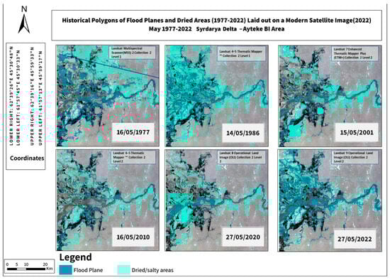 The analysis of the historical and contemporary images of the SD also reveals increasing vegetative cover, as shown in Figure 9, where the SD is greener in the years 2010–2022 than in earlier years. There is a clear correlation between Soviet policies in the SD and the increase in the amounts of dried/salty areas. The following is observed in the analysis presented in Figure 9 below.