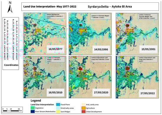 Land use and land cover assessments are analyzed using remote-sensing data. The ideal is to use high-resolution sensor images, and historical satellite images can be a challenge as a result of resolution [,]. However, examining the LULC patterns over a scale of time, focusing on elements large enough so as not to be limited to high resolution, can provide a crucial database regarding LULC. The initial stages of landscape and land use interpretation in the research area combined several automatic and semi-automatic procedures [,]. The study was conducted in a specific region of the Syrdarya Delta and analyzed selected changes in the natural and anthropogenic landscapes during a period of several decades [,]. Prior to the classification and interpretation stages, data collection was performed. Six Landsat satellite images were downloaded from the USGS Earth Explorer database https://earthexplorer.usgs.gov accessed in 25 November 2022 [,,]. The selected temporal framework focused on May to also detect and analyze vegetative cover changes. Observation images were selected for the following dates: