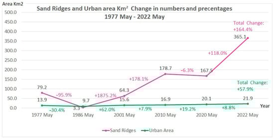 The analysis results indicate an increase of 57.9% in the urban area in the SD between May 1977 and May 2022 and a decrease of 95.9% in sand ridges until May 1986 during the Soviet regime, probably as a result of the spread of vegetative cover in the SD covering the sand ridges. Subsequently, there is a constant increase from 1987 until 2022 in the amounts of sand ridges, as can be seen in Figure 10 [,,]. This comprises a quantified analysis of different LULC in the SD between the Soviet era and the period after the USSR’s collapse in 1991.
