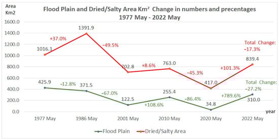 As Figure 11 shows, between May 1977 and May 1986, there is an increase of 37% in the amounts of Dried /salty areas in the SD. Since May 1986, there is a decrease of 49.5%, as seen in the analysis; the decrease continues, and from May 2020, an increase is observed again.