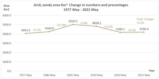 Increase in arid and sandy areas between 1977 and 2022. The total increase is 3.5%, but given the size of the lands involved, this change is quite substantial.