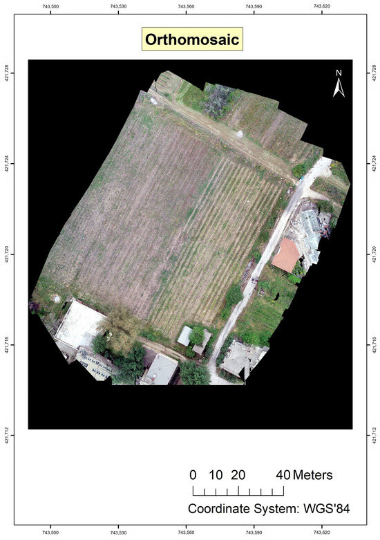 As the next step in pre-processing, an orthomosaic and a Digital Surface Model (DSM) were generated from the data collected by the UAV. This process involved geometric correction and the composition of individual images into a single, high-accuracy georeferenced representation (see Figure 3). The DSM provided information on the area’s topography, facilitating land cover data analysis [29,38].
