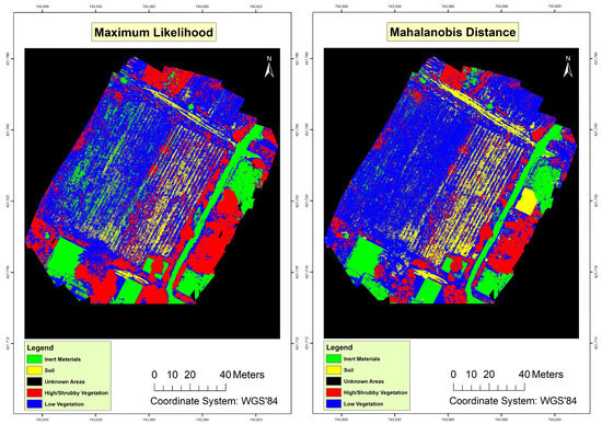 The results presented in Table 2 demonstrate distinct performance differences between the MLC and MDC classifiers. MLC outperformed MDC in categories with clear spectral boundaries, such as ‘Vegetation’ and ‘Urban Areas’, achieving higher UA. This superiority is attributed to MLC’s reliance on the assumption of normal distribution, which works effectively in homogeneous regions with distinct class separability. Conversely, MDC demonstrated better performance in spectrally complex regions, such as ‘Unknown Areas’, where it leveraged its sensitivity to spectral variation. However, the lowest agreement is found with the MDC method in the ‘soil’ category (UA 62.99%). This may be attributed to its increased susceptibility to spectral overlap in mixed land use zones, especially in heterogeneous agricultural fields with overlapping spectral signatures. These findings highlight the relative strengths and limitations of the two classifiers, emphasizing the potential added value of hybrid approach development that would allow combining the advantages of each individual classifier. The lower UA for ‘Unknown Areas’ in MDC reflects challenges with spectral overlap, particularly in mixed land use zones. The higher accuracy of MLC in categories with distinct spectral signatures highlights its robustness in such environments.