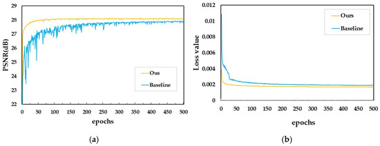 (a) Training loss value of baseline and ours; (b) validation PSNR values of baseline and ours.