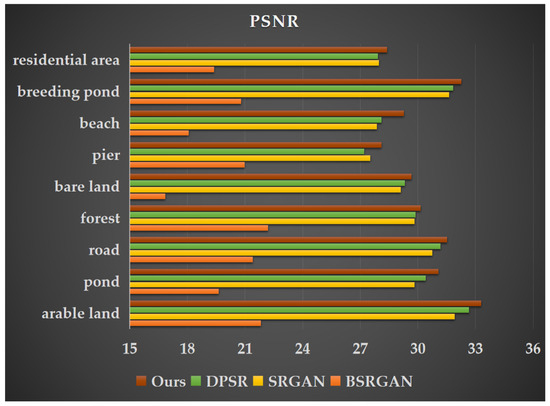 Peak Signal-to-Noise Ratio (PSNR) values of super-resolution images generated by four different methods for nine land cover types.