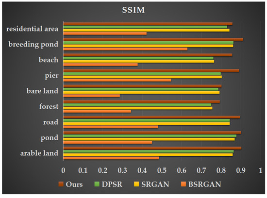 Structural Similarity Index (SSIM) values of super-resolution images generated by four different methods for nine land cover types.