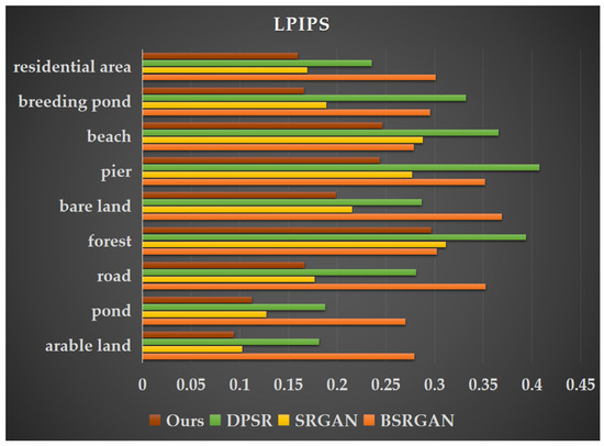 Learned Perceptual Image Patch Similarity (LPIPS) values of super-resolution images generated by four different methods for nine land cover types.
