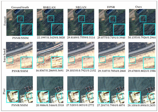 The selected remote sensing images cover a coastal land–sea transition zone with diverse land cover types, including unique landscape features such as beaches, aquaculture ponds, and docks as well as common land cover types like forests, roads, farmland, bare land, residential areas, and ponds. To evaluate the effectiveness of our approach, we conducted comparative experiments by inputting images containing these land cover types into DPSR [13], BSRGAN [12], SRGAN [38], and the improved MRSRGAN model. Table 4 presents the performance evaluation results for nine land cover types: farmland, ponds, roads, forests, bare land, docks, beaches, marine aquaculture ponds, and residential buildings. The experimental results show that MRSRGAN achieved varying degrees of performance improvement across all land cover types. Among them, the enhancement effect for beaches was the most significant. Compared to the best-performing DPSR model, MRSRGAN improved PSNR by 4.18% (1.1731 dB), increased SSIM by 14.34% (0.0949), and reduced LPIPS by 32.56% (0.1191). Additionally, the resolution enhancement for three common coastal land cover types—docks, farmland, and marine aquaculture areas—also showed significant improvements. Compared with the current state-of-the-art methods, PSNR is improved by 2.11% (0.5801 dB), 1.90% (0.62 dB), and 1.32% (0.4202 dB), while SSIM is increased by 11.52% (0.0873), 4.53% (0.0391), and 5.64% (0.0486). Additionally, LPIPS is reduced by 12.16% (0.0337), 8.68% (0.0089), and 12.04% (0.0227). These results indicate that MRSRGAN effectively captures the unique features of coastal landforms (such as docks, aquaculture ponds, and beaches) and enhances texture details. Furthermore, compared to the baseline method SRGAN, MRSRGAN achieves a PSNR improvement ranging from 0.2578 dB to 1.4089 dB across nine types of land cover, demonstrating the significant advantages of our proposed improvements in generating super-resolution images.