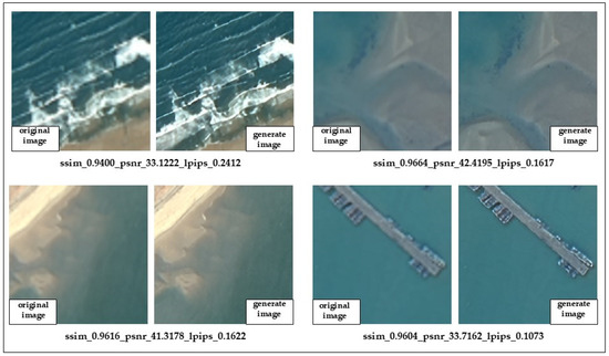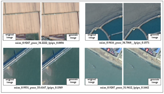 To further validate the performance of our method across different land cover scenarios, we present typical landscapes in coastal transition zones along with the corresponding verification results. We selected various land cover types, including cropland, tidal flats, offshore aquaculture ponds, docks, and beaches. As shown in Table 4, the sharpness restoration was most effective for tidal flats and beaches, with PSNR values of 42.4195 dB and 41.3178 dB, respectively. The corresponding SSIM values were 0.9609, 0.9330, and 0.9419, while the LPIPS values were 0.1617 and 0.1622. According to the study by Alain Horé et al. [36], when PSNR values exceed 30 and SSIM values are above 0.9, the generated images are of high quality. This indicates that our method effectively enhances the clarity of fine texture details while preserving the original structure and brightness when processing images of coastal transition zones.