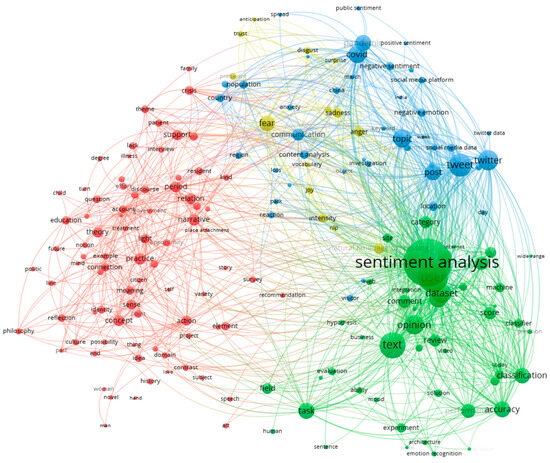 The bibliometric analysis of the results of the search in the Web of Science scientific literature database using the keyword combination, “emotion and sentiment analysis of place”, was performed using VOSviewer software version 1.6.20. The graph generated using VOSviewer [19] (Figure 2) highlights four distinct clusters of frequently co-occurring terms in publications related to emotion and sentiment analysis of place. The two predominant clusters (green and red) are larger and more densely connected, reflecting key thematic areas in this research domain.
