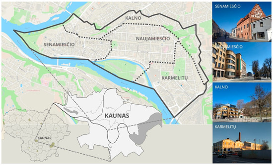 Case study area: Kaunas Center Eldership [31] and sub-elderships Senamiesčio, Naujamiesčio, Karmelitų, and Kalno located within it. Figure and photographs by the authors.