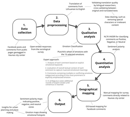 According to Merschdorf and Blaschke [7], the complexity and multi-faceted nature of a place make it difficult to quantify various aspects and require multidisciplinary research approaches. Thus, the methodology for analyzing the content of social media posts, comments, and open-ended responses from the sociological survey applied in this research combines both qualitative and quantitative methods and can be identified as a mixed-method approach. Such an approach was selected based on previous research [8], aiming for a more comprehensive understanding of the emotional landscape of Kaunas city center by capturing both specific emotional categories and overall sentiment polarity. After the data were collected, the analysis involved several sequential steps (Figure 4). First, all the original comments, which were written in Lithuanian, were translated into English to enable accurate processing using natural language processing tools, as most sentiment analysis tools are optimized for English-language texts. It is necessary to note that as Lithuanian comments were translated into English for sentiment analysis, potential nuances in emotional expression, such as cultural metaphors and colloquial slang, might be partially lost or altered, potentially influencing the accuracy of the VADER sentiment analysis. This issue was addressed by involving bilingual researchers in validating translation quality and cross-validating between original and translated texts. For the qualitative analysis, the classification of emotions by Plutchik [23] was employed. In this study, sixteen specific emotions from the wheel of emotions by Plutchik [23] were selected for analysis: Serenity, Interest, Annoyance, Boredom, Pensiveness, Distraction, Apprehension, Acceptance, Joy, Anticipation, Anger, Disgust, Sadness, Surprise, Fear, and Trust (Table 1). These emotions were chosen because they represent a balanced range of both positive and negative emotional states, as well as intermediate emotional tones, ensuring that the analysis captures subtle differences in emotional expression. The selection also reflects emotional states commonly encountered in urban environments, where experiences can range from joy and interest in vibrant public spaces to annoyance and fear in less favorable conditions [8]. The written comments from Facebook pages and the sociological survey were examined, and each comment was manually assigned an emotional label based on the selected categories using an expert approach. The classification process partially relied on a keyword-matching technique, wherein specific emotional cues in the text were identified and linked to their corresponding categories, although the general moods and possible connotations of the comments were also considered. This approach provided insights into the types of emotions experienced by individuals. In the emotional classification process, each comment was analyzed based on explicit emotional keywords derived from Plutchik’s model [23], supplemented by the evaluation of the overall textual context to capture nuanced emotional meanings. Comments containing multiple or conflicting emotions were categorized according to the most prominent or explicitly emphasized emotion, with ambiguous cases undergoing additional rounds of expert review until consensus was reached.