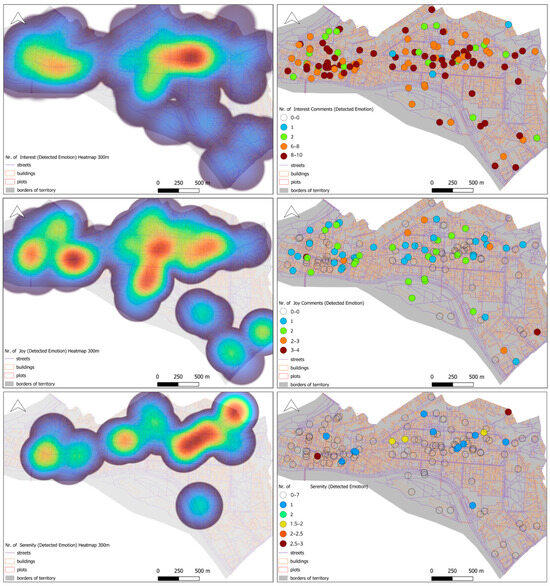 A key component of both sentiment and emotional analysis is spatial representation, as geographic information systems (GISs) allow for the visualization of emotions through emotion maps. These maps provide a spatialized view of how different locations are associated with specific emotional responses, helping urban planners and policymakers identify areas that evoke strong positive or negative feelings. Emotion maps have been successfully utilized in studies examining social media content, survey responses, and other texts, where geotagged data enable the spatial analysis of public sentiment [5,8].