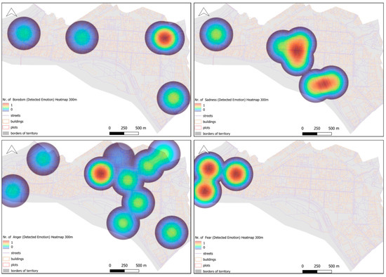 Results of the emotion analysis of Facebook posts and comments distributed on the map of Kaunas Center Eldership: distribution of Boredom, Sadness, Anger, and Fear. Colors in the heatmaps represent the density of emotional responses, with warmer colors (red, orange) indicating areas of higher emotional intensity and cooler colors (blue, green) indicating lower intensity. Figures by the author.
